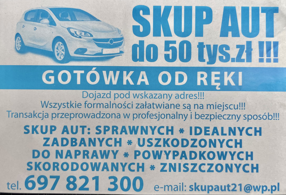 SKUP AUT DO 50 TYS ZŁ .SKUP AUT RÓŻNYCH MAREK W STANIE IDEALNYM , ZADBANE , DO NAPRAWY , POWYPADKOWE , SKORODOWANE , NA CZĘSCI , ZNISZCZONE . BEZ OC I PRZEGLĄDU . ZA AUTA SALONOWE OD PIERWSZEGO WŁAŚCICIELA PŁACIMY NAJWIĘCEJ .KONTAKT TEL 697821300 LUB EMAIL skupaut21@wp.pl .Uszkodzone-powypadkowe-idealne-skorodowane-po nauce jazdy- po taxi-firmowe-na części