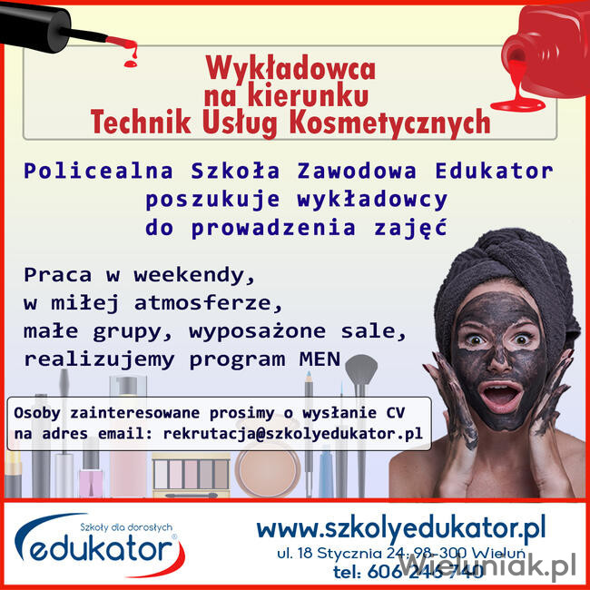 Nauczyciel praktycznej nauki zawodu w Szkole Policealnej Edukator w Wieluniu, na kierunku Technik usług kosmetycznych.