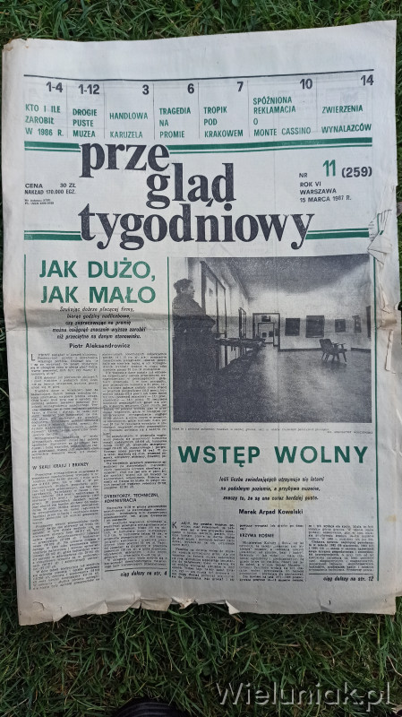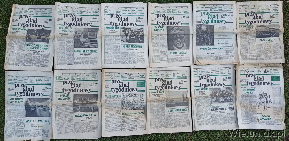 -"Przegląg tygodnowy": łącznie 122 gazety , lata 1984-1989, wielkość A2/A3, częśc gazet jest pomieszana (niekompletne i pomieszane strony), ogólnie stan raczej słaby/średni, sporo jest egzemplarzy które mają naderwane w mniejszym lub większym stopniu strony, dużo jest gazet z zabrudzonymi/poplamionymi i pognieconymi stronami ,ale takie w dobrym stanie też są; cena za 1 gazetę od 1 do 5 zł w zależności od stanu, sprzedaję jako całość