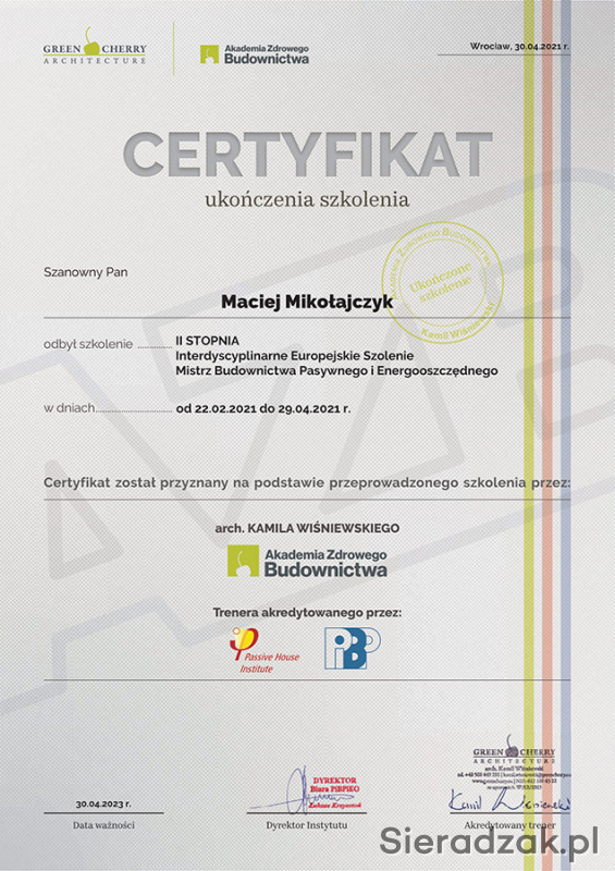 wykonywaniu zarówno projektów budynków usługowych, produkcyjnych jak i mieszkalnych. Posiadam certyfikat Mistrza Budownictwa Pasywnego i Energooszczędnego uznawany przez Niemiecki i Polski Instytut Budownictwa Pasywnego. Staram się wprowadzać innowacyjne i energooszczędne rozwiązania w swoich projektach. Pamiętaj, że dobrze opracowany projekt to oszczędność czasu i pieniędzy na budowie. Zapraszam do współpracy.mgr inż. arch. Maciej Mikołajczyk.
