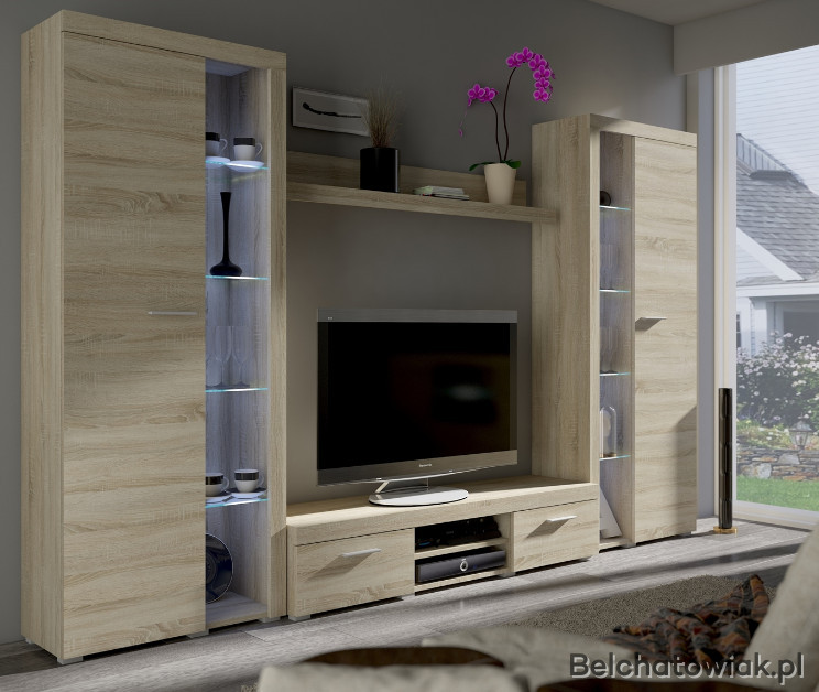 Meblościanka posiada otwarte szklane półki, które można podświetlić oświetleniem LED co jeszcze bardziej podkreśli charakter mebla