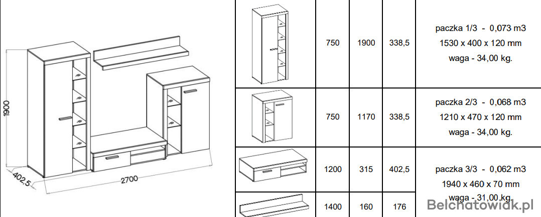 Meblościanka Rumba (Zdjęcia 1,2,3,4,5,6) :(szerokość 270cm,wysokość 190cm,głębokość 40,5 cm).