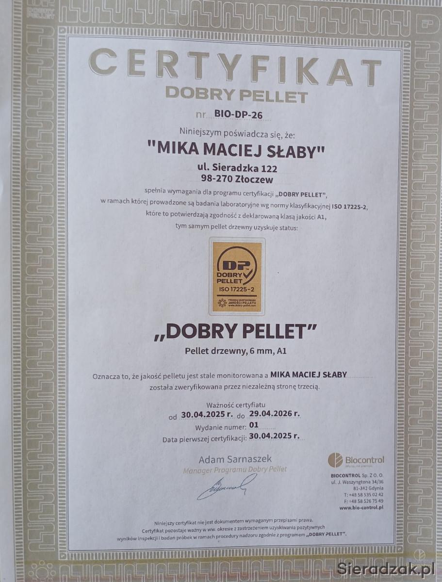 Pellet A1 sprzedam. Pellet certyfikowany . . Możemy zabezpieczyć transport. Miejsce załadunku 98-270 Złoczew.