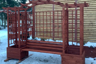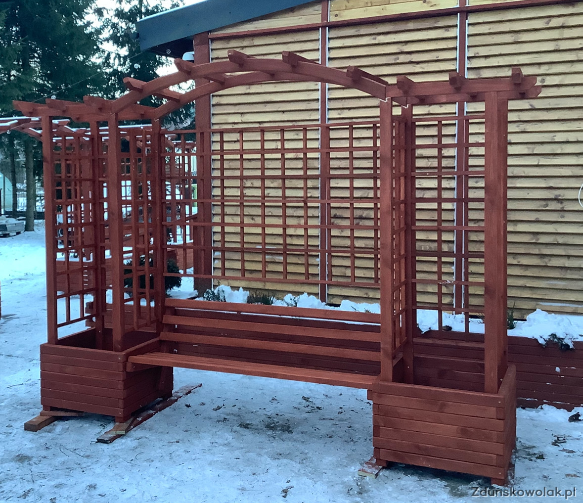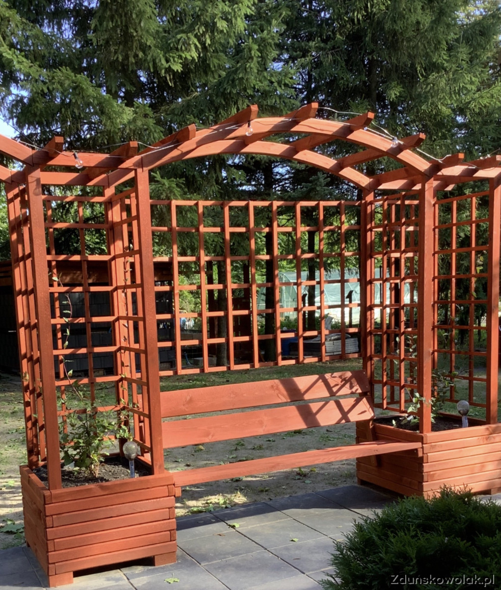 Nie jest to produkt marketowy, tylko solidna konstrukcja zaprojektowana jako miejsce do siedzenia, cienia i odpoczynku. Kratki pod pnącza dają prywatność, a ławka tworzy gotową strefę relaksu.